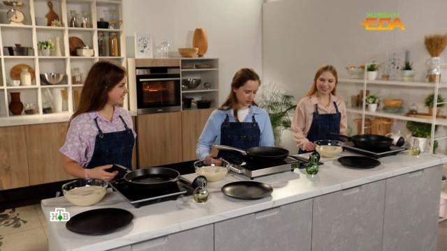 Появилась сейчас и гибридная посуда из облегченного чугуна с уже готовым антипригарным слоем. Уменьшения веса добиваются, колдуя с формой сковородок при помощи пресса. Получается ли удобно? И где лучше вкус? Программа «Живая еда» провела испытания и выяснила, что блины лучше всего получаются на обычной антипригарной сковородке, они тоненькие и легко отходят. Блины на облегченной сковороде с защитой от пригорания постоянно подгорали — покрытие не спасало. А блины, приготовленные на классической увесистой сковородке с ее обилием жира, оказались самыми сочными.