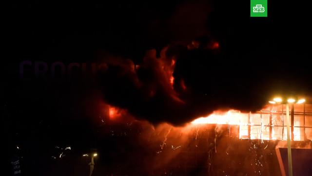 Огонь распространился на весь фасад концертного зала Crocus City Hall, который сегодня атаковали вооруженные террористы.