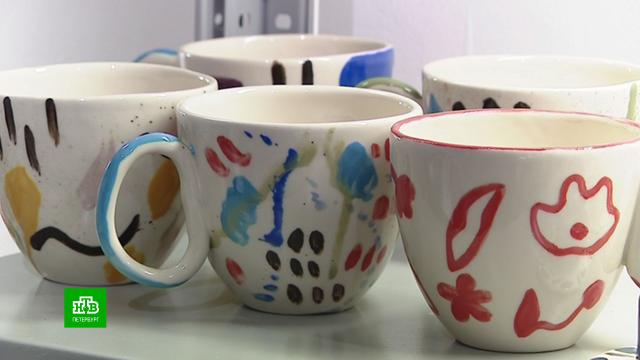 Игорь уверенно наносит глиняным мелком рисунок на будущую чашку. Кот Леопольд его любимый персонаж. В процессе работы рядом с ним появится еще и симпатичный пес. Уникальное изделие особенного мастера в скором времени обязательно