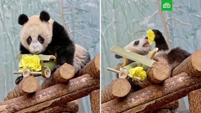 Киперы Московского зоопарка подарили панде Катюше самолетик из бамбука в честь ее дня рождения.
