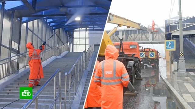 В Москве коммунальщики промывают надземные пешеходные переходы в рамках подготовки к зиме.