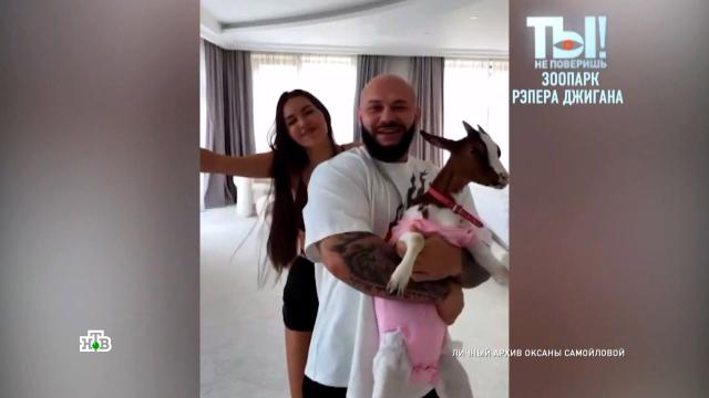 Репортеры НТВ выяснили, зачем рэпер Джиган завел козу, которую одевает в дорогие наряды, водит по ресторанам и разрешает той спать на кровати.