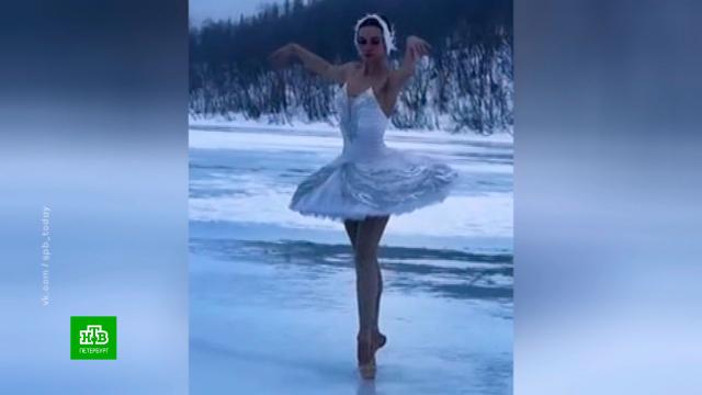 Леденящий душу танец показала на льду балерина Мариинского театра Ильмира Багаутдинова. Партию из «Лебединого озера» она исполнила на озере Малый Вудъявр в центре Кольского полуострова.