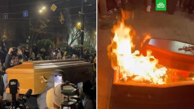 В ночь на вторник участники акции протеста в Тбилиси принесли к парламенту настоящий деревянный гроб с чучелом основателя правящей партии «Грузинская мечта — Демократическая Грузия» Бидзины Иванишвили и подожгли. Также протестующие повесили на установленную мэрией Тбилиси у здания парламента новогоднюю елку баннеры политическими лозунгами, в том числе с призывом к США и Евросоюзу ввести санкции в отношении «Грузинской мечты».