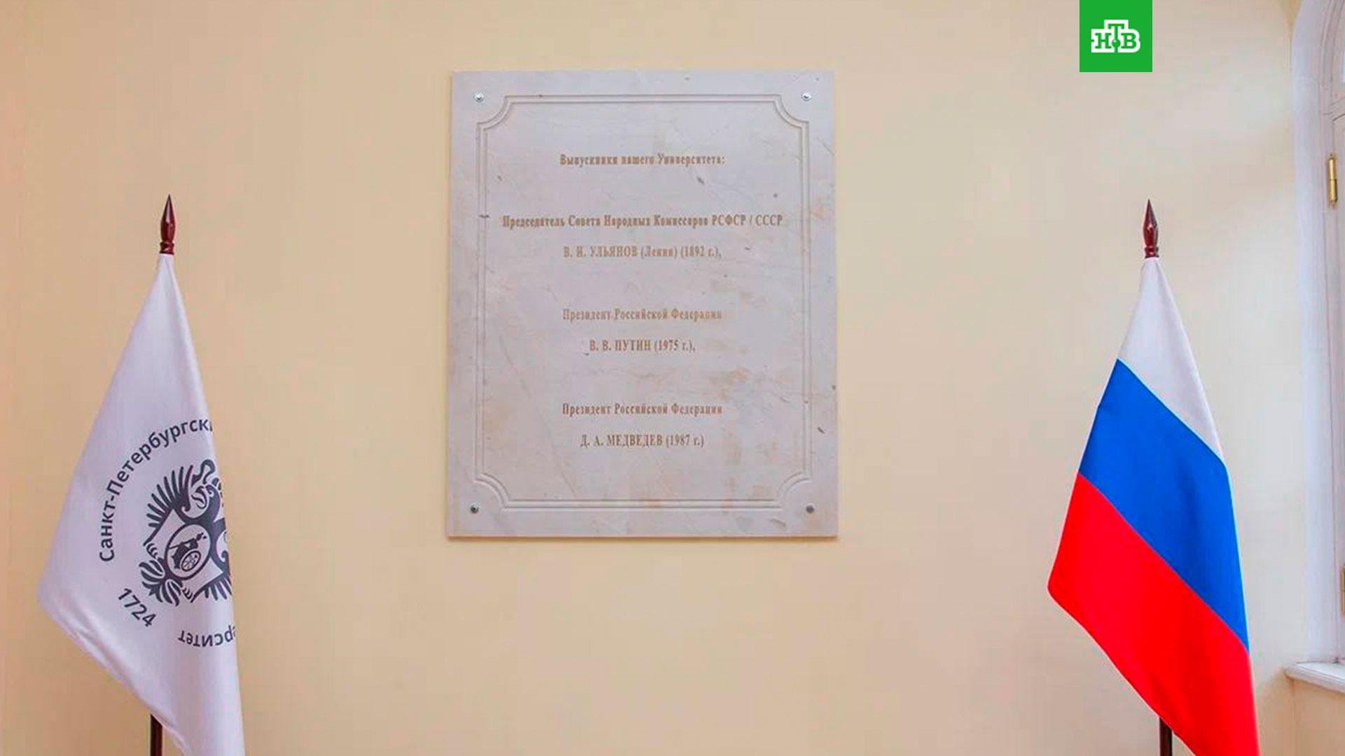 На мраморной доске выбиты имена Владимира Ленина, Владимира Путина и Дмитрия Медведева. Там также указаны должности политиков в качестве глав государства и даты окончания их учебы в вузе.
