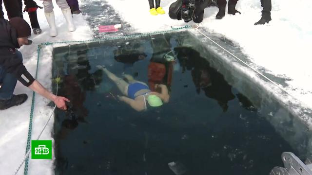Российская спортсменка Екатерина Некрасова установила новый мировой рекорд. Она проплыла подо льдом Байкала 122 метра, преодолев эту дистанцию за 1 минуту и 39 секунд.