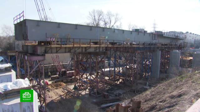 Ниткой строители называют массивные металлоконструкции, связанные между собой, по которым потом поедут автомобили по двум полосам в каждом направлении, а еще велосипедисты и самокатчики по своей дорожке и пешеходы по тротуару. Всё это над землей будут удерживать восемь опор. Причем для заливки бетона пришлось занять часть территории между железнодорожными путями.