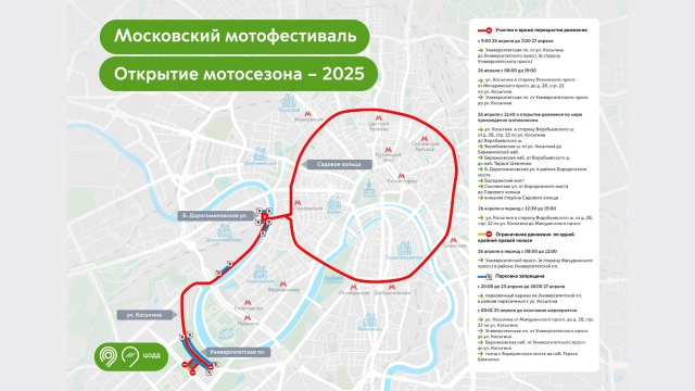 Также с 08:00 до 12:00 движение закроют на крайней правой полосе на Университетском проспекте в районе Университетской площади, с 08:00 до 19:00 — на улице Косыгина от Мичуринского проспекта до дома 28, строения 22, и на Университетской площади от Университетского проспекта до улицы Косыгина, с 12:30 до 15:00 — на улице Косыгина в сторону Воробьёвского шоссе от дома 28, строения 22, до Мичуринского проспекта. С девяти часов утра 25 апреля до 07:00 27 апреля будет перекрыто движение на Университетской площади от улицы Косыгина до Университетского проспекта.