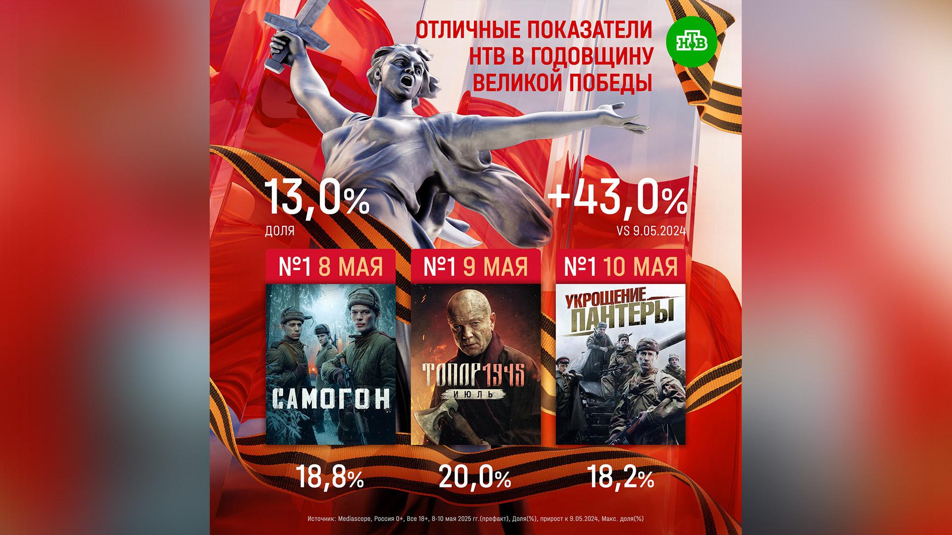 9 мая, в годовщину Великой Победы, доля телеканала НТВ выросла на 43,0% относительно прошлого года и составила 13,0% среди зрителей всей России старше 18 лет.