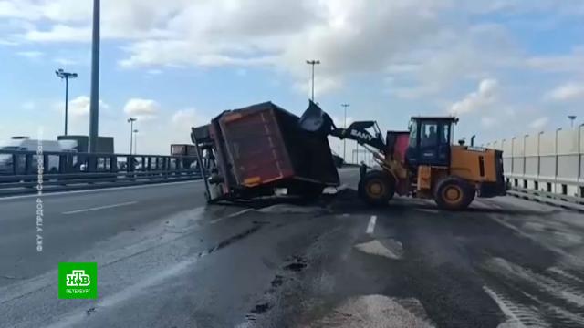 Утром внешняя сторона КАДа встала от развязки с Софийской улицей, где перевернулся груженый самосвал. Развалившийся грузовик занял больше половины проезжей части.