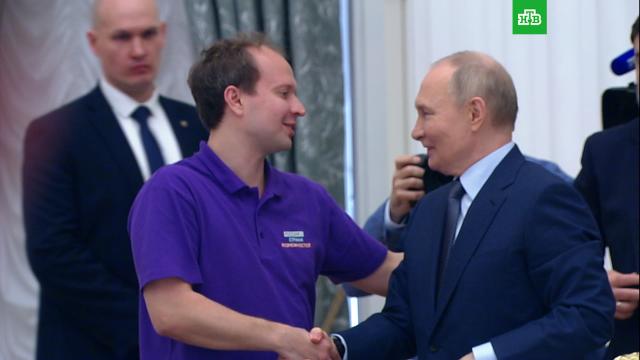 Президент России Владимир Путин пожал руку участнику наблюдательного совета АНО «Россия страна возможностей» Ивану Ерхову, полностью потерявшему зрение.