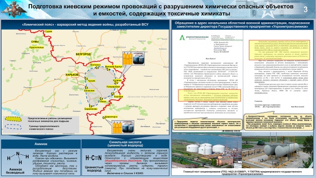 В Минобороны РФ предоставили доказательства того, что киевский режим намерен устроить очередную провокацию с применением 550 тонн жидкого аммиака. Об этом на брифинге рассказал начальник войск радиационной, химической и биологической защиты ВС РФ генерал-майор Алексей Ртищев.