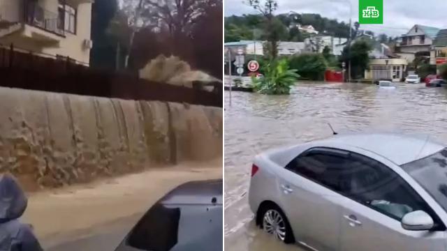 Улицы в Сочи затопило после мощного ливня, который накрыл город минувшей ночью. Местные жители делятся в соцсетями кадрами с места.