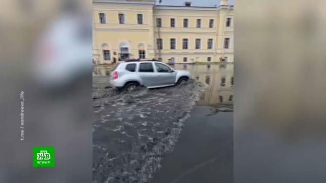 В «Водоканале» отчитались, что за 20 минут выпало более 17 мм осадков. Коммунальщики поясняют: система водоотведения находится в исправном состоянии, но ее мощности может не хватить. Так, в Ломоносове на Привокзальной площади разлилось целое озеро. Тонули автомобили и автобусы, а пешеходы переплывали дорогу на надувной лодке.