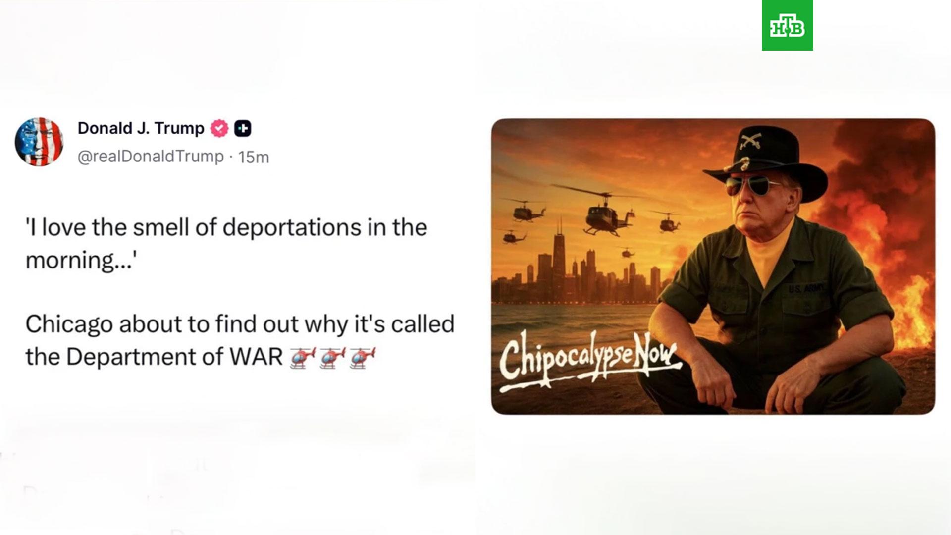 Ранее Трамп в соцсети опубликовал картинку с надписью «Чипокалипсис сегодня» и заявил, что «любит запах депортаций по утрам». Также Трамп пригрозил, что Чикаго «скоро узнает, почему это называется „министерство войны“» (накануне президент США переименовал в министерство войны министерство обороны).