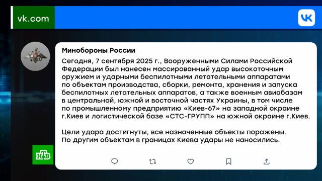 Как сообщили в Минобороны, сегодня массированный удар был нанесен по местам производства, хранения и запуска БПЛА, а также военным авиабазам на Украине.