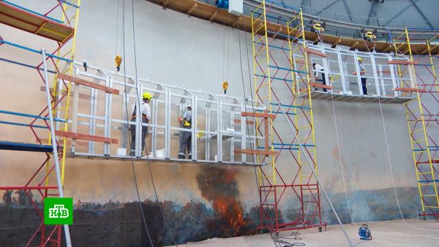 Под купол музея художников поднимают на люльках, разработанных для этого зала. При этом панораму не искажают лишние конструкции, это важно для контроля уже проделанной работы.