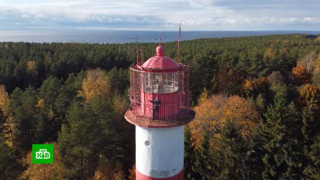 От подножия маяка до самого верха ведет винтовая лестница. Съемочная группа НТВ вслед за смотрителем Александром Метлушко поднялась по ней и оказалась над макушками деревьев, на 52 метрах над уровнем моря. С такой высоты на пригорке на мысе открывается лучший вид на главный корабельный фарватер, ведущий в