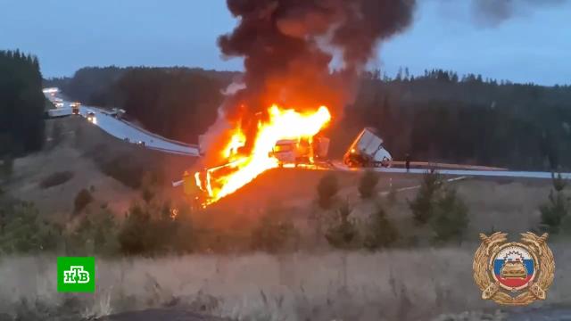 После аварии начался пожар, большегрузы вспыхнули как факелы. По предварительным данным, погиб водитель автовоза, еще один участник ДТП ранен.