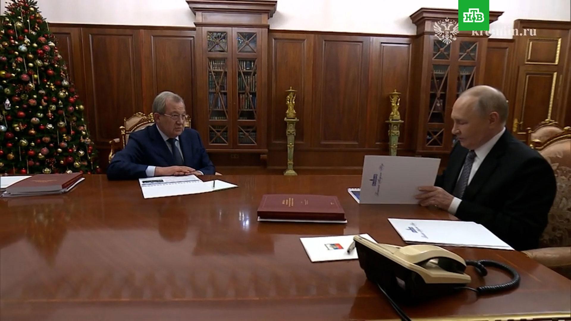 Елка попала в кадр на встрече главы государства с президентом Российской академии наук Геннадием Красниковым. Она украшена игрушками красных, золотых, зеленых и серебристых тонов.