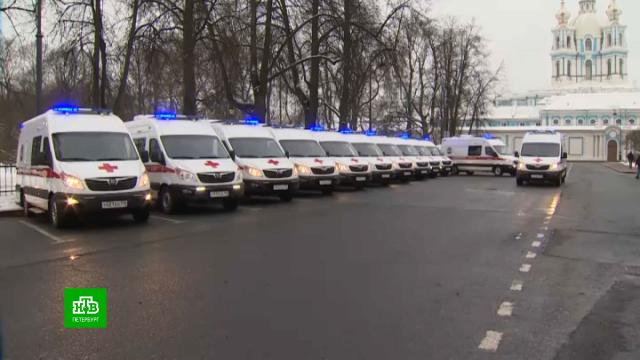 К Смольному собору сегодня съехались кареты скорой помощи. Губернатор Александр Беглов провел смотр автомобилей из новой партии. Город закупил их для «Медсантранса».