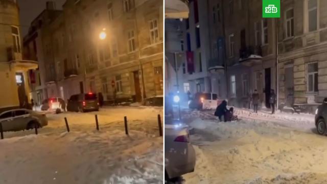 В городе Львове военком бросил в снег девушку, которая отчаянно пыталась отбить своего насильного мобилизованного парня.