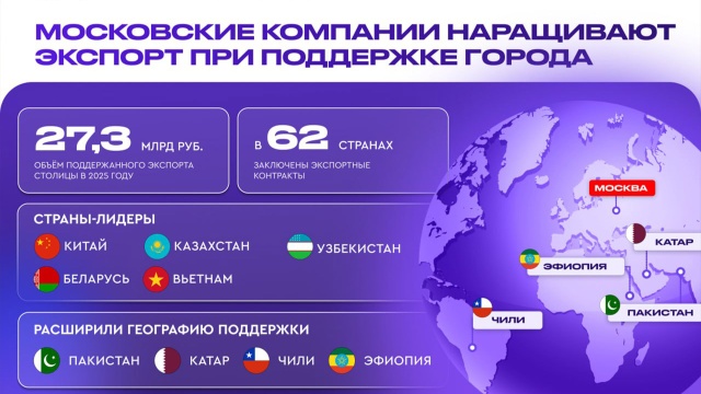 Москва помогла столичным компаниям подписать контракты в 62 странах, сообщил мэр Сергей Собянин. По его словам, власти активно поддерживают бизнес, экспортирующий свою продукцию на международные рынки. Для этого у Московского экспортного центра есть множество инструментов. В прошлом году объем поддержанного МЭЦ экспорта достиг 27,3 млрд рублей.