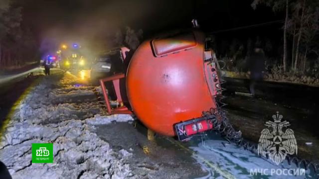 В Волховском районе Ленинградской области легковой автомобиль столкнулся с бензовозом. Погибли два человека, топливо вылилось на дорогу.