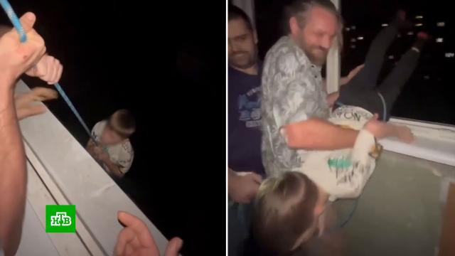 В Сети обсуждают видеозапись, на которой мужчина спускает своего маленького сына на тросе с седьмого этажа.