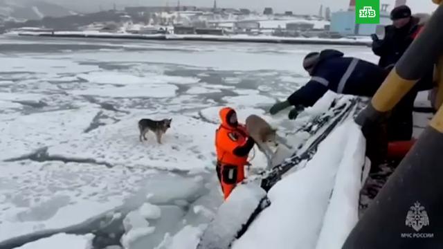 Сотрудники МЧС спасли собак, два дня просидевших на отколотой льдине у берегов Камчатки.