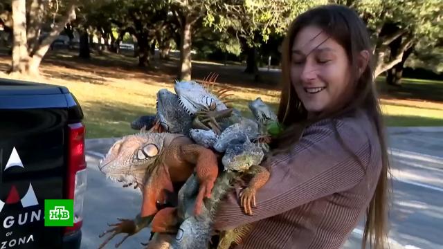 Жители Флориды полотенцами и фенами отогревают оцепеневших от мороза игуан