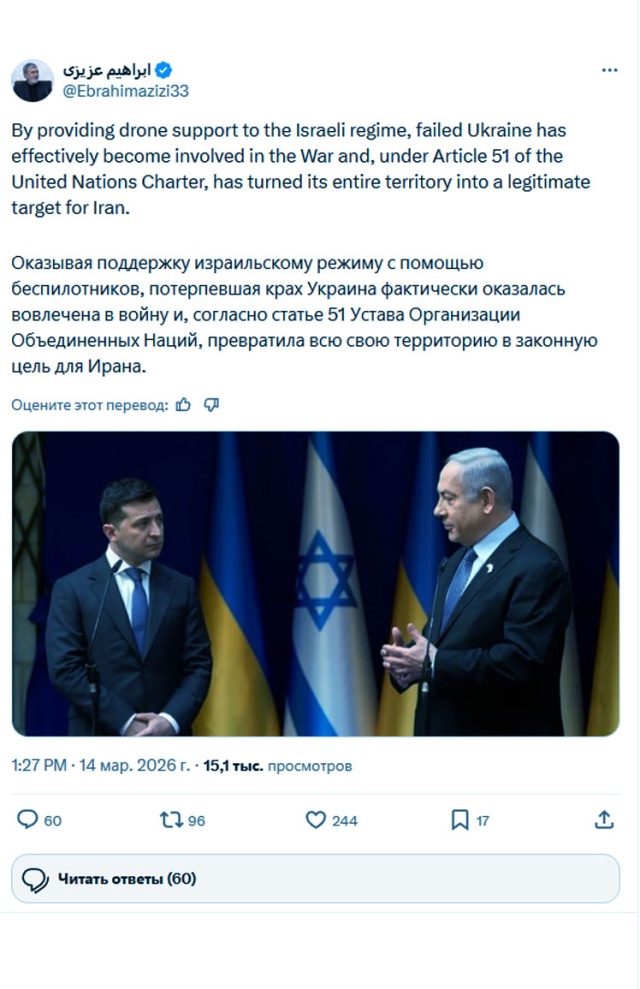 Глава комиссии по национальной безопасности парламента Ирана Ибрагим Азизи опубликовал на своей странице в соцсети X совместную фотографию Владимира Зеленского и Биньямина Нетаньяху и написал, что «потерпевшая крах Украина», помогая Израилю беспилотниками, фактически оказалась вовлечена в войну на Ближнем Востоке.