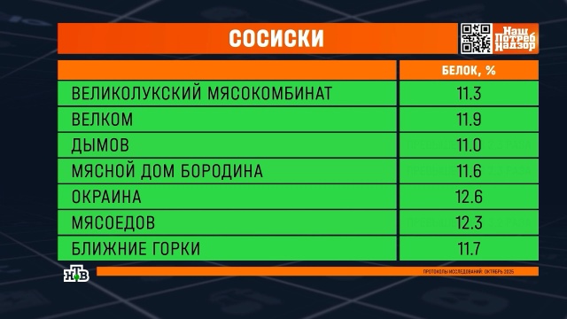 Первым делом эксперты подсчитали количество белка. По госстандарту его должно быть не меньше 11 процентов. И все производители уложились в норму. А больше всего белка в сосисках «Окраина» и «Мясоедов».