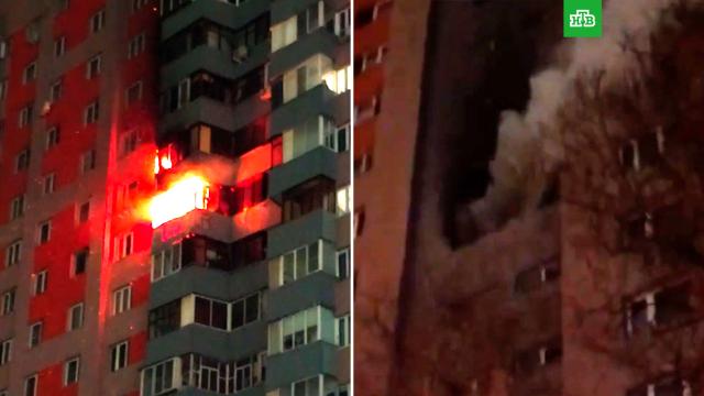 Очевидцы сняли на видео кадры пожара в 17-этажном жилом доме в Подмосковье.