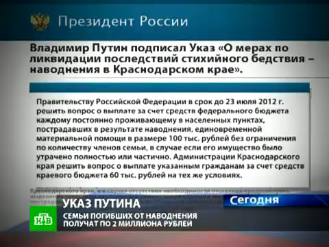 Владимир Путин подписал указ о мерах по ликвидации последствий наводнения в Краснодарском крае.