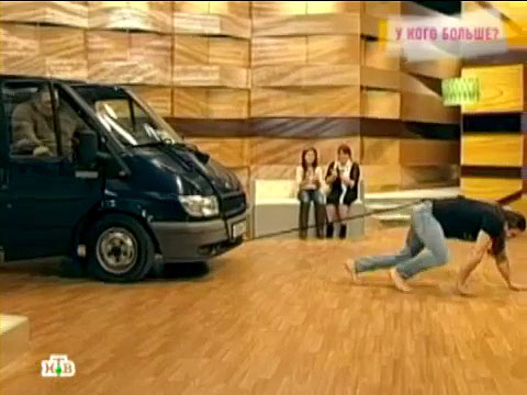 В студии программы «Говорим и показываем» Брюс Хлебников принял участие в необычном эксперименте — сдвинул своими волосами автомобиль с людьми.
