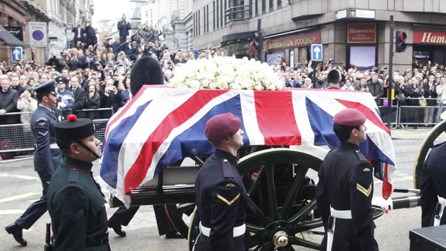 Расстояние в три километра гроб с Маргарет Тэтчер преодолел за час. Это была очень медленная, торжественная процессия чтобы все люди, которые выстроились вдоль перекрытых лондонских улиц, смогли отдать последние почести