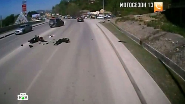 Мотоцикл от удара разлетается на куски, а его хозяина ударяет об асфальт.