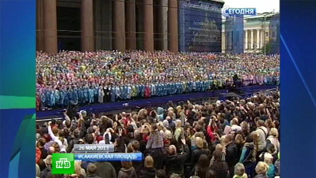 Событие, которым Петербург накануне отмечал юбилей, претендует на мировой и российский рекорды. 4 тысячи 335 человек — от школьников до ветеранов, от профессиональных певцов до любителей — хором исполнили песни на ступенях Исаакиевского собора.