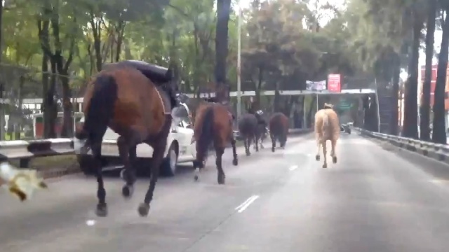 Десятки перепуганных полицейских лошадей устроили скачки по одной из центральных улиц Мехико, распугав прохожих.