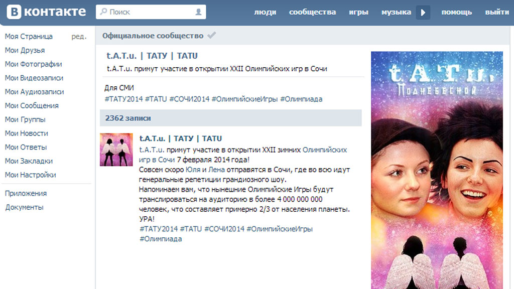Заявление группы t.A.T.u.: «Совсем скоро Юля и Лена отправятся в Сочи, где вовсю идут генеральные репетиции грандиозного шоу. Напоминаем вам, что нынешние Олимпийские Игры будут транслироваться на аудиторию в более 4 000 000 000 человек, что составляет примерно 2/3 от населения планеты».