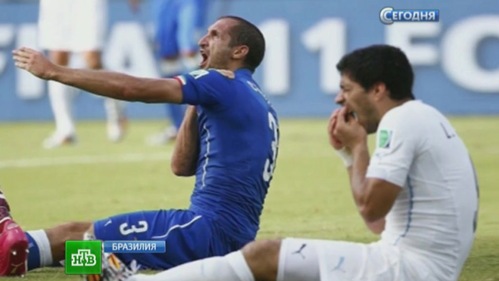 Футболисту Суаресу грозит дисквалификация за укус итальянца КьеллиниСамый громкий матч минувшего игрового дня на чемпионате мира по футболу в Бразилии может обернуться длительной дисквалификацией для нападающего сборной Уругвая Луиса Суареса. ФИФА сегодня возбудила против него дисциплинарное производство за… игру зубами. Суарес столкнулся с итальянским защитником Джорджо Кьеллини и укусил его в плечо. Уругвайский форвард, конечно, заявил, что ничего подобного не делал, но следы от укуса, продемонстрированные итальянцем, оказались убедительнее слов.
