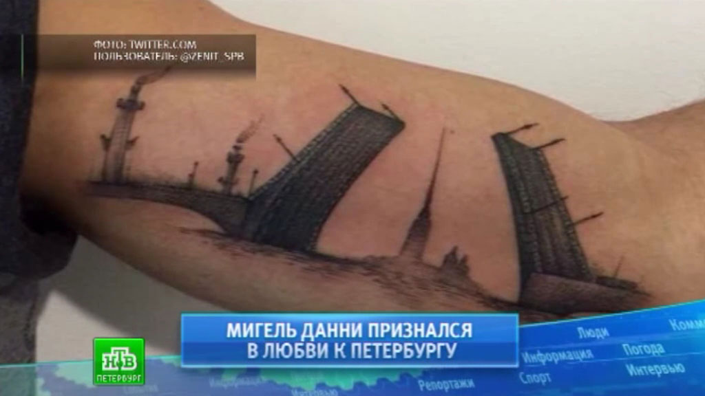 Мигель Данни сделал татуировку в знак прощания с Питером и «Зенитом»Недавно на левой руке португальского полузащитника появилась татуировка с видом разведенного Дворцового моста и шпиля Петропавловской крепости. По словам Данни, в момент создания татуировки вероятность его ухода уже составляла 50%.