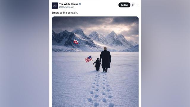 В официальном аккаунте Белого дома в соцсети X появилась сгенерированная ИИ картинка, на которой Дональд Трамп идет по снегу с пингвином, который несет американский флаг, а вдали на фоне гор развевается флаг Гренландии.