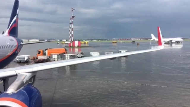 Летное поле в Шереметьево залило водой во время шторма: видео