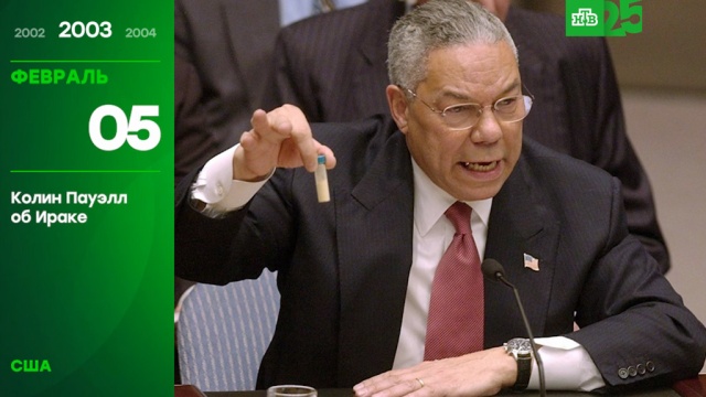 2003 Госсекретарь США Колин Пауэлл в Совбезе ООН обвиняет Ирак в разработке оружия массового поражения. В качестве полемического приема он демонстрирует знаменитую пробирку, показывая, сколь малое количество опасного вещества может привести к серьезным проблемам. Подобных пробирок у режима Хусейна, по словам госсекретаря, уже десятки тысяч. Позднее Пауэлл признает, что данные, которыми он пользовался, когда готовил доклад, были неточными. А специальная комиссия установит, что на момент вторжения в марте 2003 года у Ирака не было оружия массового поражения.